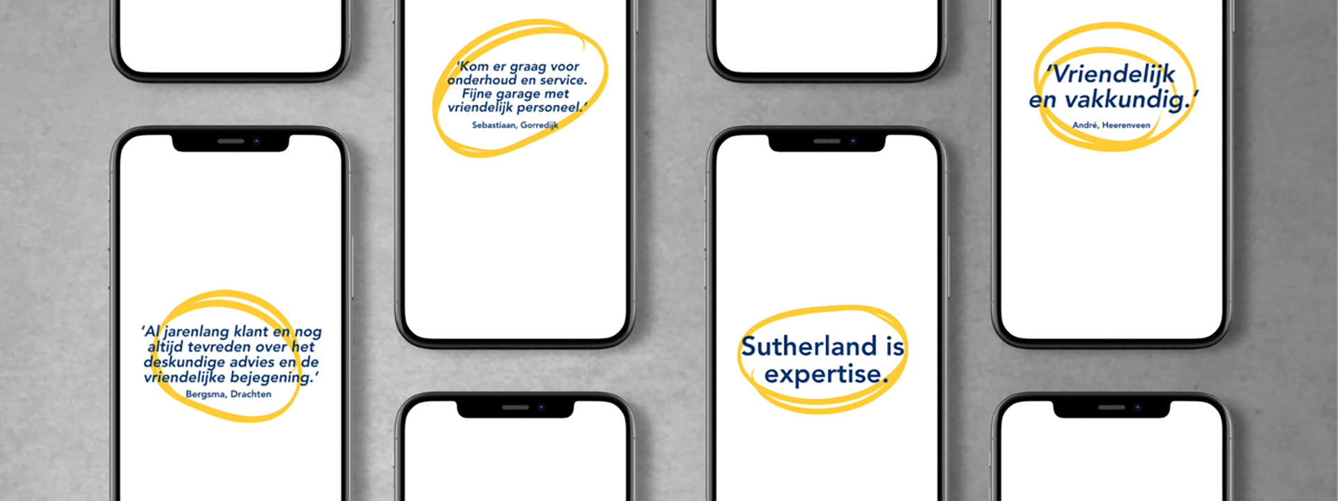 Het valt ons al jaren op hoe tevreden klanten zijn met de diensten van Ford Sutherland: de gemiddelde klantbeoordeling schommelt al heel lang rond het cijfer 9 en dat is best uitzonderlijk. Dit gegeven was ons uitgangspunt om een 360 graden brandingscampagne te ontwikkelen. In deze campagne zetten we de merkwaarden betrouwbaar, expertise en persoonlijk centraal. Én we zetten het resultaat van deze merkwaarden centraal: de positieve klantbeoordelingen.